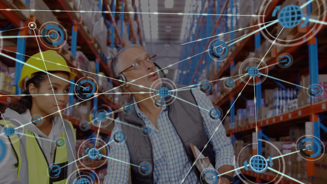 Warehouse setting with a male supervisor and female worker discussing logistics with digital network overlays, ideal for illustrating themes of technology integration in logistics, global connectivity, and modern inventory management. Useful for articles or presentations about industry innovations or team collaboration in supply chain processes.