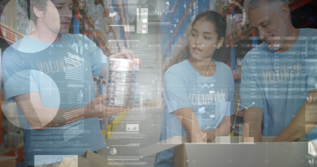 Volunteers in blue shirts focus on tasks in a warehouse using innovation evidenced by digital financial overlays. This portrayal of multi-ethnic cooperation in business and logistics operations is suitable for illustrating themes of data-driven decision-making in logistics, charitable activities emphasizing precision, or advancements in inventory management systems.