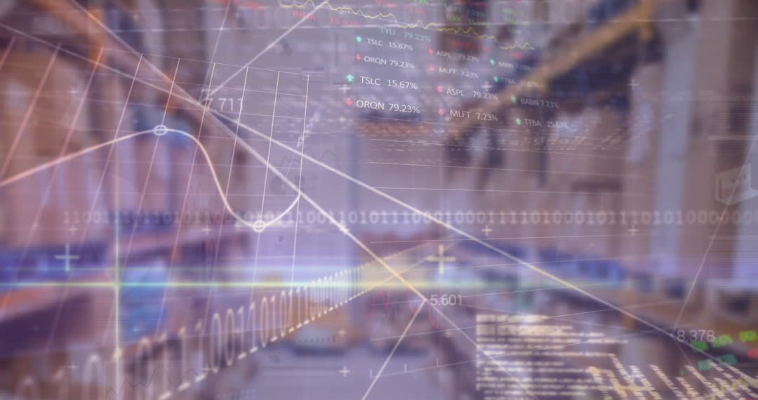 This scene shows lines of financial data and graphs overlaid on a blurred view of a warehouse interior. It emphasizes the intersection of logistics and finance in modern industries, highlighting data-driven decision making. Ideal for use in articles about economic trends, digital transactions in the supply chain, or technological advancements in trade and delivery services.