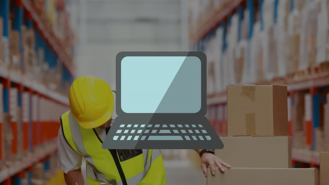 Male warehouse worker in helmet and high visibility vest handling boxes with a digital laptop icon overlay. Conveys integration of technology in logistics and inventory management. Useful for illustrating modern warehouse environments, automation, and workplace safety concepts.