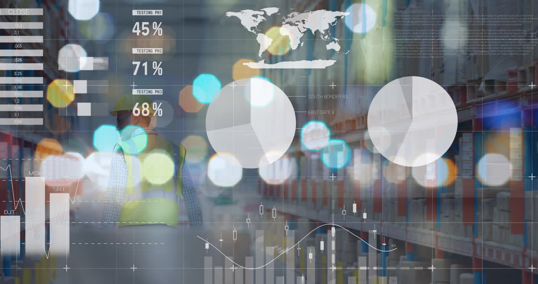 - Warehouse Worker Analyzing Data Infographic Overlay