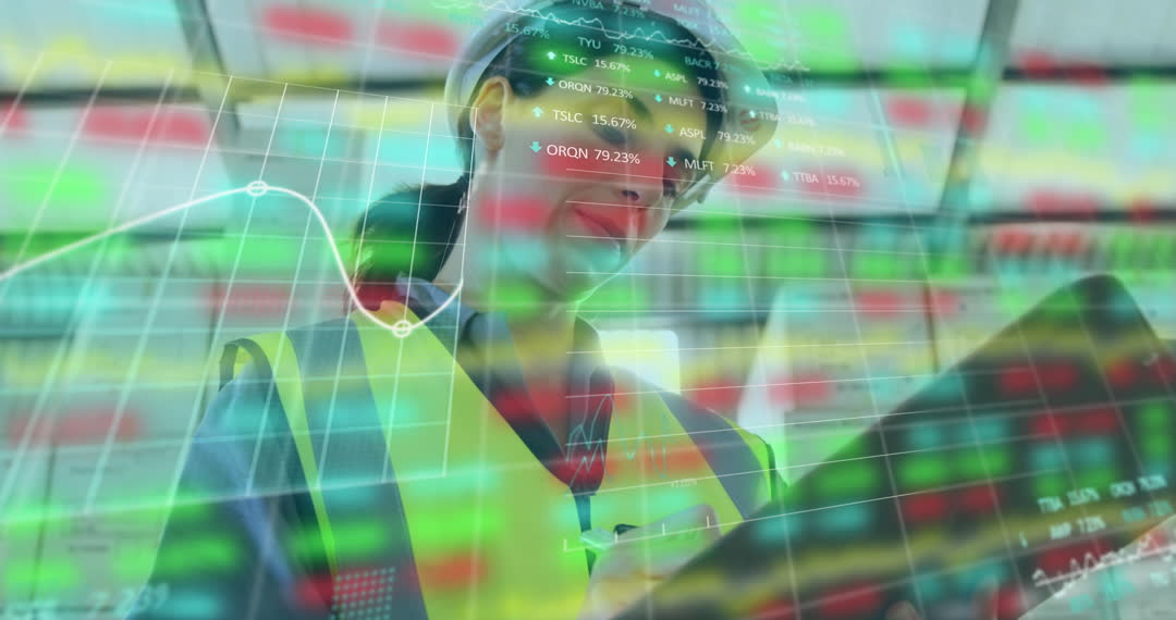 Caucasian female worker in high visibility vest appears thoughtfully interacting with digital screen displaying stock market data charts. This video symbolizes integration of technology in day-to-day operations in warehouses and industry settings. It can be used for illustrating technology influence in logistics, industry trade operations, or workforce evolution with digital innovations.