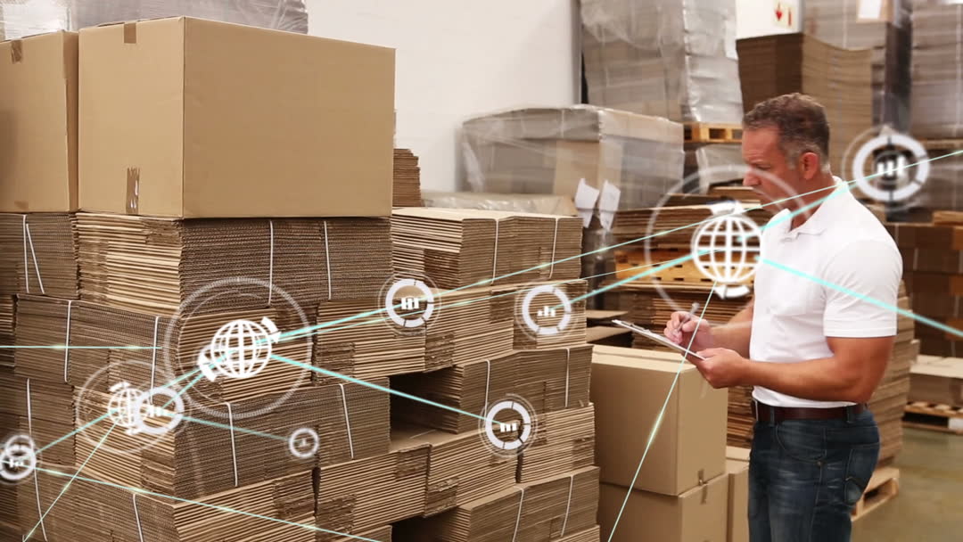 A worker wearing casual attire checks inventory against a list amidst stacked cardboard boxes in a tech-enhanced warehouse. Digital network symbols indicate online technology integration, suggesting modern logistics or e-commerce processing. Suitable for uses in industry articles, logistics, and contemporary warehousing operations.