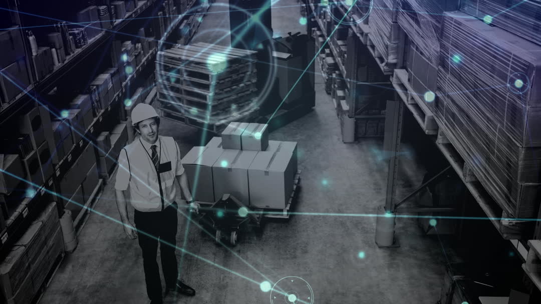 Caucasian warehouse worker is navigating a logistic environment with digital connections overlay, symbolizing modern digitalization in delivery services and supply chain management. This conveys innovation and efficiency through technology in industrial settings, highlighting progressive approaches in logistics industries. Ideal for content related to advancements in logistics, smart warehouse systems, and tech integration in industrial environments.