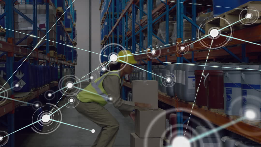 Warehouse Worker Handling Boxes with Digital Connection Overlay Video