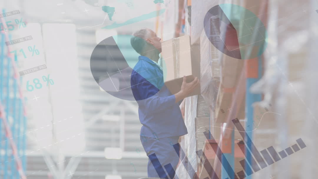 Image depicts logistics with a worker in a warehouse lifting boxes, overlaid with graphs and statistical data. Useful for illustrating modern business analyses within supply chain management, logistics efficiency, or stock assessments in industrial operations.