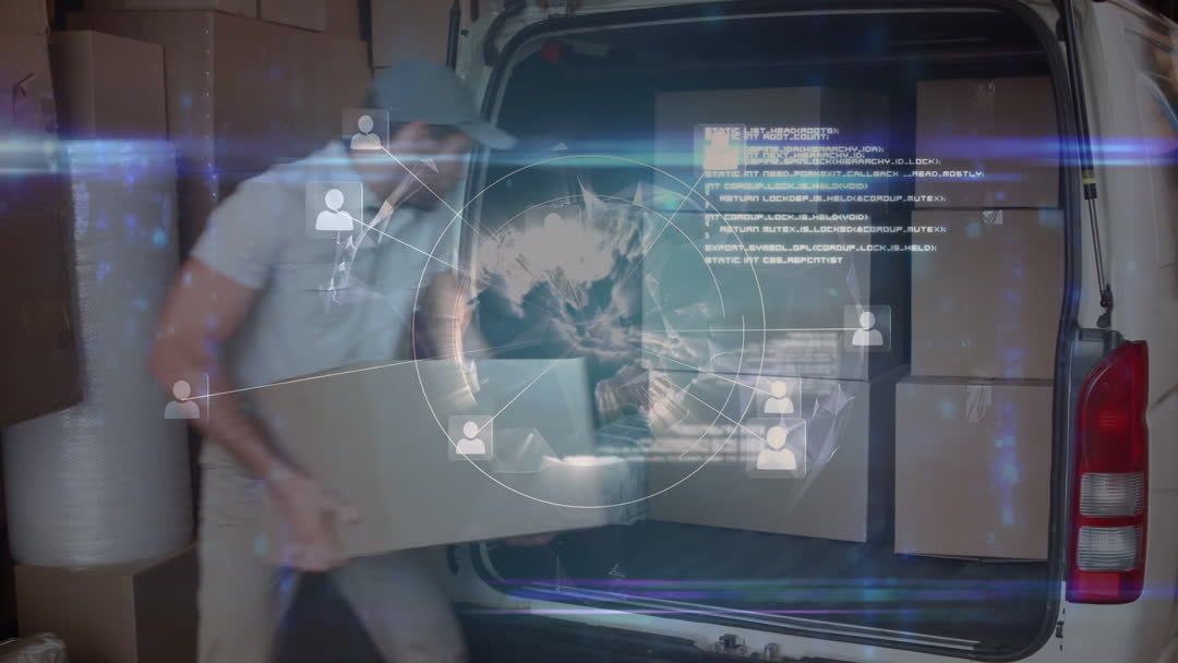Warehouse Worker Loading Van with Futuristic Digital Interface Overlay Video