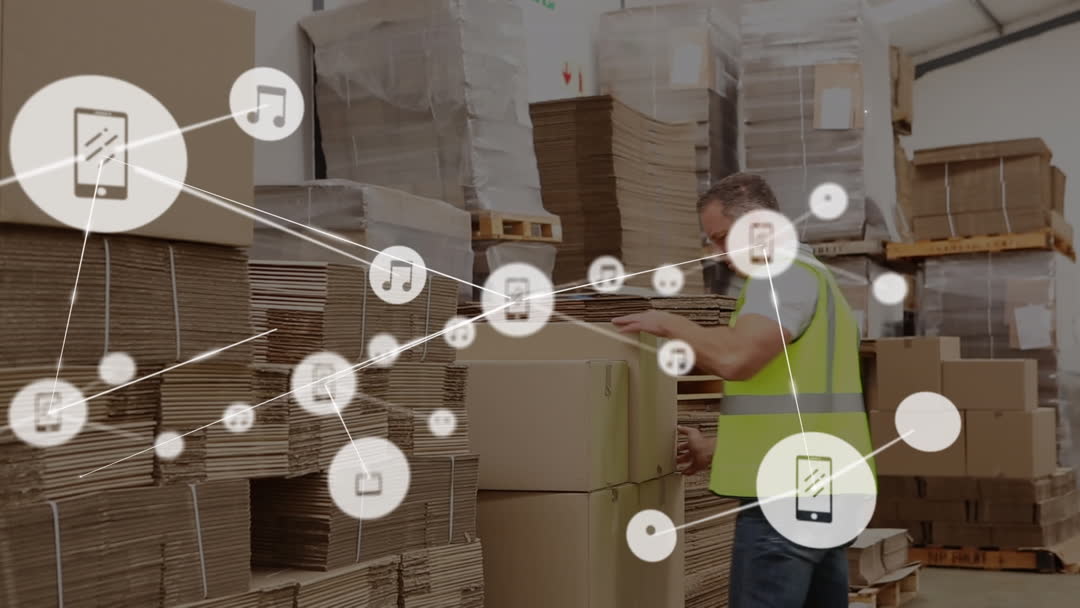 Person in high-visibility vest organizing boxes surrounded by network connection graphics representing digital communication and smart technology in logistics environment. Useful for content on modern warehousing, shipping solutions, inventory control, and global supply chain management advancements.