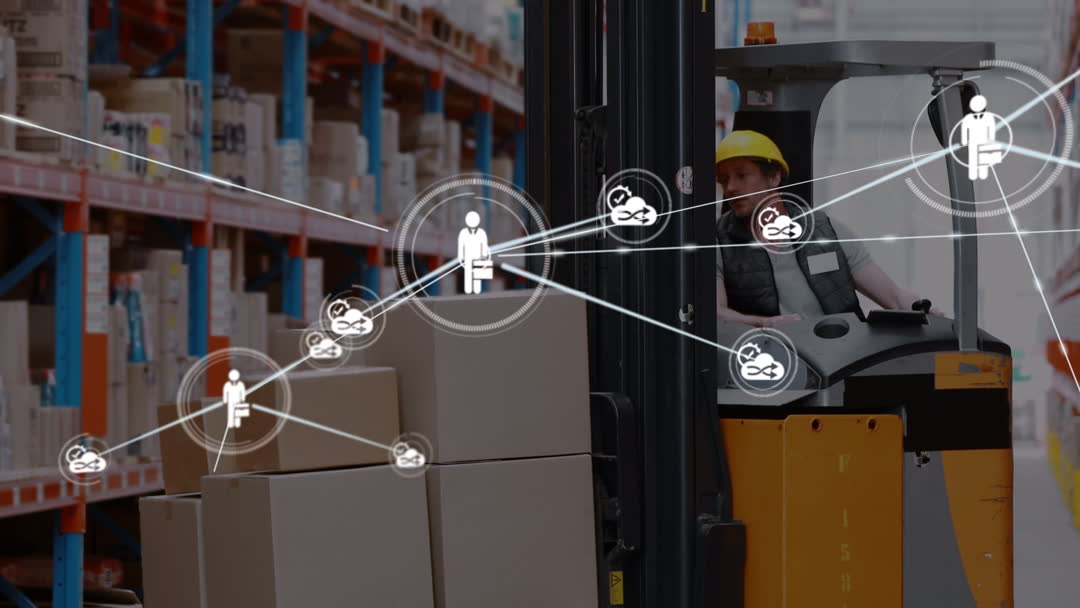 Warehouse setting portrays worker operating machinery surrounded by warehouse shelves and boxes. Superimposed digital graphics symbolizing connectivity and technology in logistics suggest themes of automation, digital inventory management, and advanced supply chain solutions. Useful for illustrating concepts in modern warehousing, digital transformation in logistics, and technology-driven delivery systems.