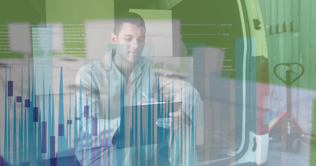 An illustration blending shipping logistics with financial data visualization. It shows a mixed-race male worker handling inventory in a van, implying the intersection of physical and digital management. Can be used in articles discussing warehousing efficiency, digital transformation in logistics, or global shipping trends.
