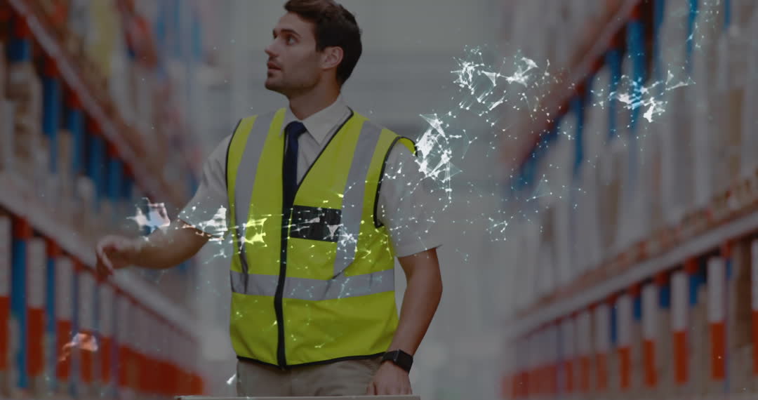 The scene captures a warehouse worker in a high-visibility safety vest, surrounded by animated neon lights. The combination of industrial environment and digital effects symbolizes the modernization of logistics and global shipping networks. This visual is ideal for use in articles or campaigns related to industrial innovation, supply chain technology, and modern warehouse management.