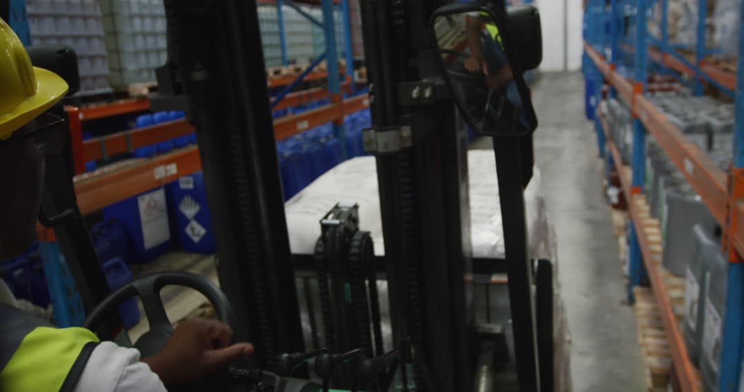 Middle-aged biracial male warehouse worker skillfully driving forklift truck through storage aisle filled with goods. Ideal for illustrating concepts of warehouse operations, supply chain management, inventory control, and skilled labor in logistics. Useful for articles, blogs, and training materials related to warehouse efficiency and equipment handling.