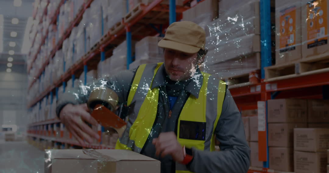 - Warehouse Worker Packing Box with Overlay of Glowing Light Spots