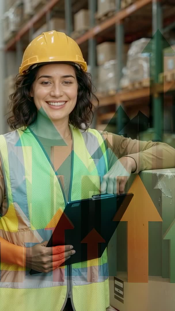 AI Generated Image. Worker wearing yellow hard hat and reflective safety vest smiling while reviewing inventory on tablet in busy warehouse aisle. Rising arrows graphic overlay conveying growth, productivity, efficiency, and data-driven logistics. Vertical 9:16 format optimized for mobile, social media stories, reels, in-app ads. Suitable for corporate presentations, supply chain reports, warehouse operations training, ecommerce fulfillment case studies, recruitment campaigns. Use as hero clip on logistics websites, background for data dashboards, opener for product launch videos, visual for articles about inventory management, warehouse automation, operational efficiency. Color palette featuring industrial neutrals with high-visibility yellow adding focal point. Clip delivering modern, confident tone and emphasizing technology-driven workflow.