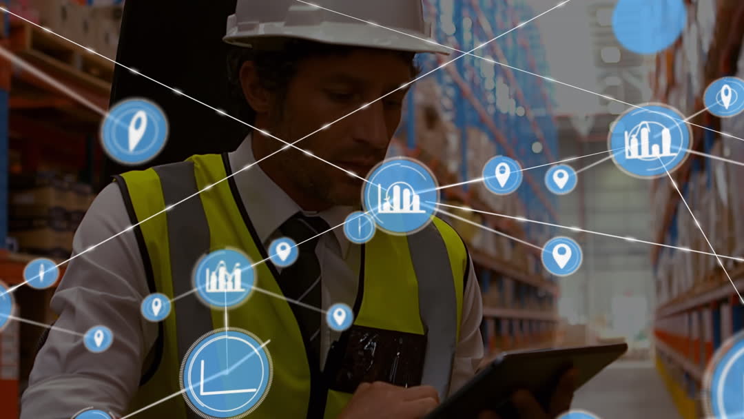 Warehouse scene featuring a Caucasian male worker equipped with a hard hat and safety vest using a tablet, interacting with a digital interface symbolized by floating icons and connections overlaying the video. Ideal for showcasing advancements in logistics, emphasizing the digital transformation in warehouse management and operations.