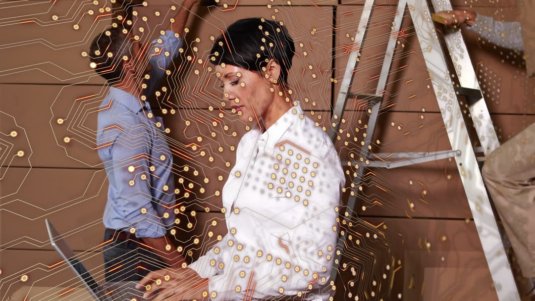 Image shows a biracial female warehouse worker using a laptop with an animated overlay of an integrated circuit pattern. Ideal for illustrating themes of technology integration in warehouses, the convergence of traditional and digital workspaces, or innovative workplace solutions.