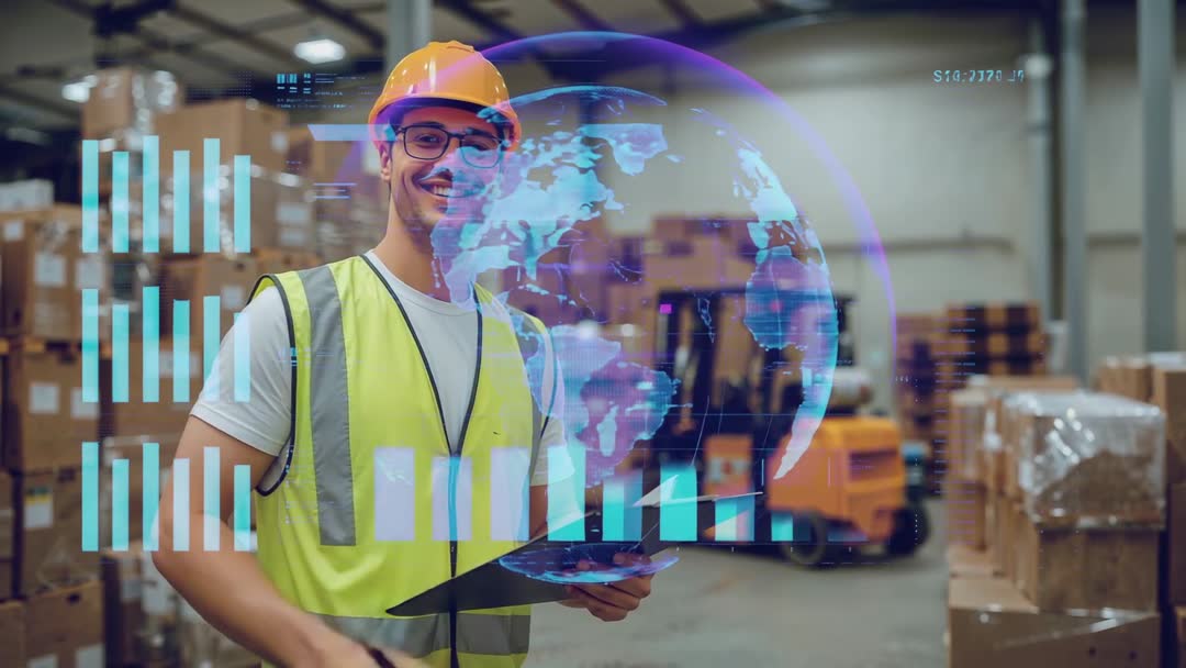 Warehouse Worker with Augmented Reality Tech and Global Data Display Video