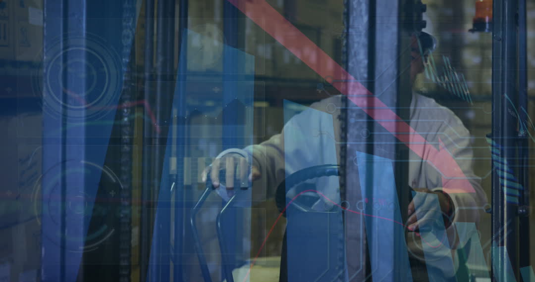 This abstract video artistically combines a warehouse worker operating in an industrial setting with elements of financial data processing overlaid. This graphical representation contrasts the physical aspect of goods processing with digital financial environments, symbolizing the intricate nature of global trade. It is an excellent visual depiction for illustrating articles or presentations on import-export dynamics, the intersection of financial systems, and supply chain logistics.