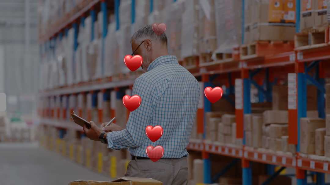 Man standing in a warehouse surrounded by boxes, holding a clipboard with heart icons digitally superimposed. Conceptual video suitable for illustrating emotions in business environments or modern digital processes. Useful for marketing campaigns focusing on logistics, supply chain efficiencies or innovative technology.
