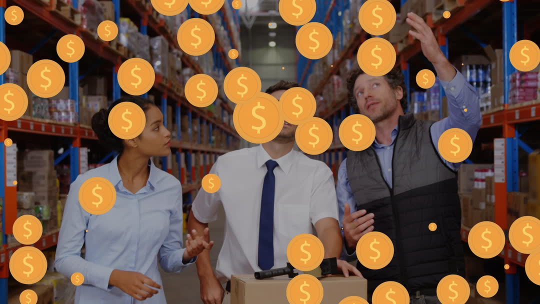 Warehouse team inside a large distribution center collaborating while animated digital currency symbols fall around them, symbolizing innovation and economic growth. Image useful for articles on digital transformation in logistics, economic trends, and teamwork in business environments.