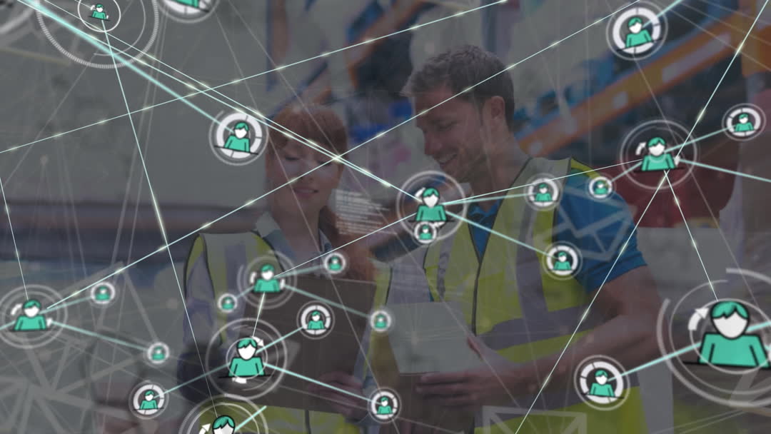 Image shows coworkers in a warehouse wearing safety vests, actively engaged in a discussion while interacting with digital icons representing technology integration. Multiple exposure creates an overlay of interconnected symbols illustrating themes of communication, data systems, and collaborative work environment. Ideal for illustrating technology adoption in the logistics sector, promoting smart warehouse solutions, or supporting content on workforce digitalization.