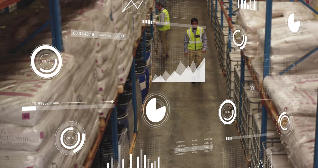Footage illustrates warehouse workers in high-visibility vests confidently traversing aisles filled with stacked goods. Augmented reality overlays display graphs and data, signifying the integration of advanced technology in verifying inventory levels and optimizing logistics. Ideal for showcasing modern inventory practices, enhancing supply chain training resources, or highlighting productivity improvements through digital innovations in industry settings.
