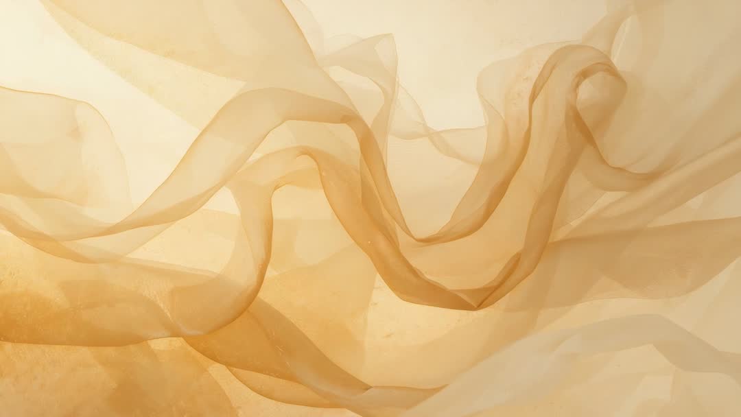 AI Generated Image. Video frame showing warm backlit chiffon fabric flowing in slow motion, creating soft translucent waves and layered folds in beige tones. Use as background for fashion promo, product showcase, luxury branding, wedding invitation loop, website hero video, social media story, TV commercial overlay, title sequence, meditation app visual, slideshow transitions, textile design reference and color palette inspiration. Adding elegant motion, soft texture and neutral color depth to visual projects. Working well with blend mode overlays, slow-motion looping, text reveals and subtle parallax effects. Suiting luxury, wellness, bridal and interior design campaigns. High-key warm backlight creating translucent layering and delicate shadow play, offering versatile neutral palette for color grading and motion graphics.