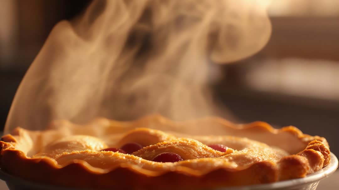 AI Generated Video. A freshly baked fruit pie is visibly cooling on a dish, with steam gracefully rising. The warm and inviting bake suggests a cozy and comforting atmosphere in a sunlit home kitchen, providing a nostalgic and rustic appeal. This evocative scene is ideal for illustrating themes of home cooking, family gatherings, or advertisements needing a touch of comfort food charm.