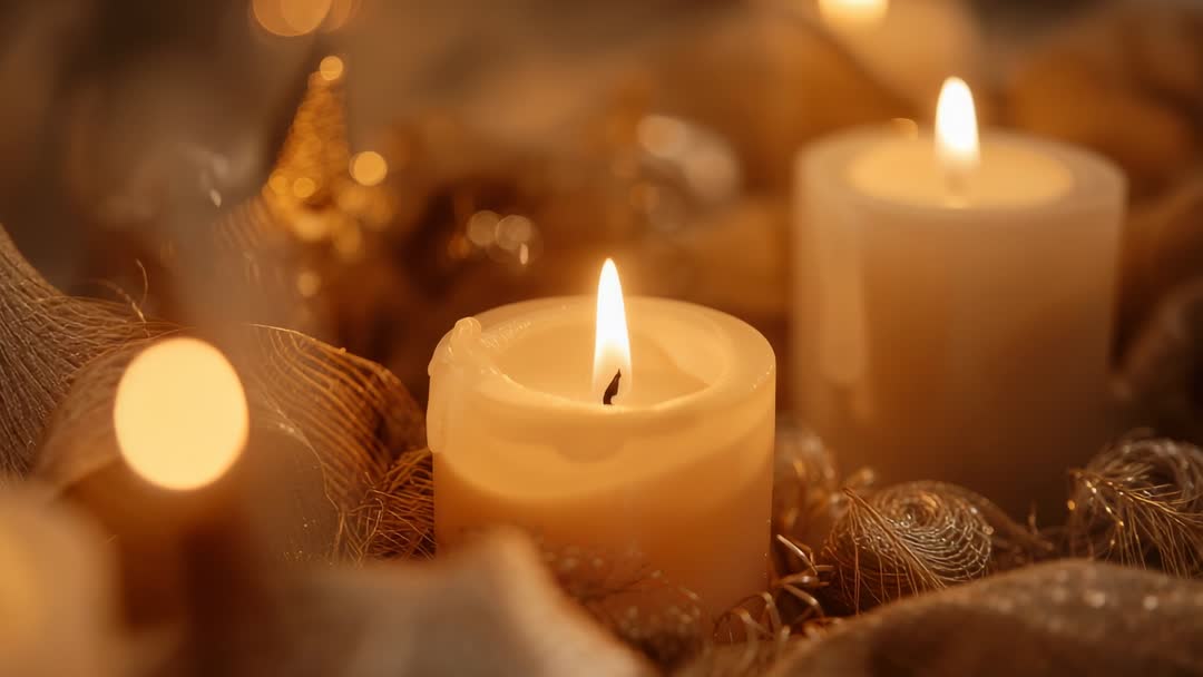 - Warm holiday candles flickering on mantel with golden ornaments and soft bokeh glow