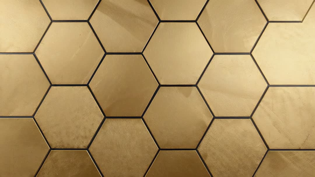 AI Generated Image. Close-up video showing warm light sweeping across brass hexagon panels, revealing seams, smudges, and brushed-metal texture. Camera movement producing subtle highlights and soft reflections while panels displaying honeycomb geometry and repeating grid. Material imperfections adding tactile realism and vintage luxury vibe. Ideal for luxury brand intros, architectural visualization, interior design presentations, motion graphics overlays, website hero backgrounds, product packaging mockups, advertising campaigns, social media reels, cinematic B-roll, and title sequences. Loop-friendly clip for seamless background use. Color palette featuring warm gold tones and muted shadows, allowing easy color grading and text overlay. Crop or pan for 16:9, vertical, or square formats and combine with smooth ambient audio for atmospheric effect.