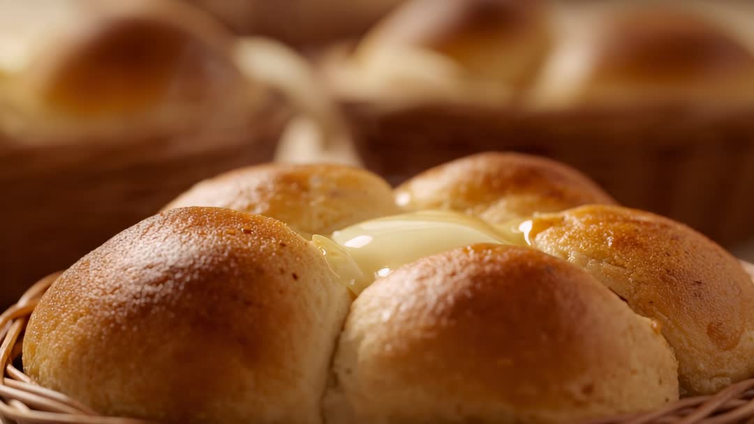 - Warm pull-apart dinner rolls with melting butter spreading across golden crust in wicker basket