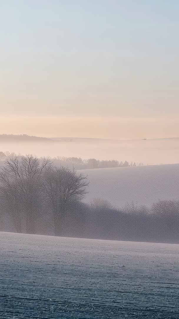 AI Generated Video. Video clip capturing warming dawn light nudging low mist across frost-covered slopes and bare tree silhouettes. Vertical composition emphasizing layered ridges and soft pastel sky. Frost adding subtle texture to foreground field while mist softening distant hedgerows. Providing peaceful, atmospheric footage for use in nature, travel, or wellness projects. Working well as vertical social media background, mobile wallpaper, Instagram Reels, TikTok content, app splash screens, or cinematic B-roll for documentaries and seasonal commercials. Allowing easy color grading for warm or cool tones and combining with ambient sound for meditation or relaxation videos. Including negative space in upper frame for overlay text, titles, or logo placement.