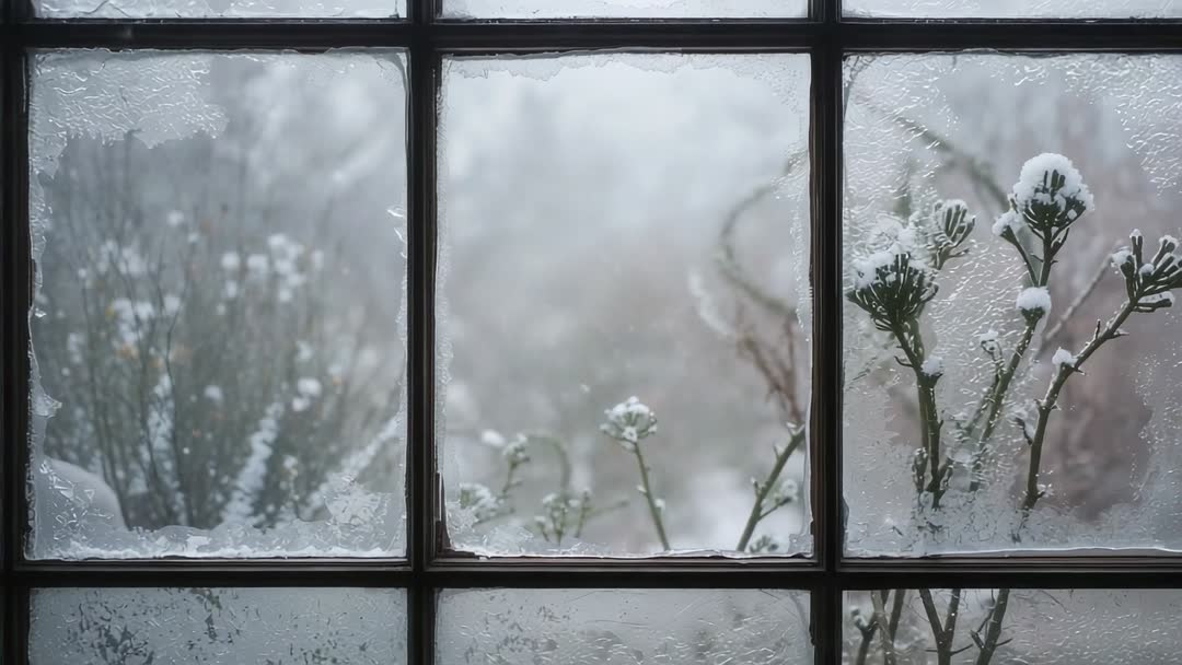 AI Generated Video. Showing slow-motion view of snow-laden shrubs outside frosted nine-pane window, delicate snow caps resting on branches while frost thinning along glass edges. Featuring shallow depth of field, soft focus, muted cool tones, and gentle bokeh for intimate winter mood. Supplying calm, contemplative footage ideal for website hero, social media reels, seasonal commercials, wellness and mindfulness videos, and home decor promotions. Working well as seamless ambient loop for retail displays, streaming backgrounds, meditation apps, and opening shot for longer winter sequences. Allowing copy space around central panes for title overlays, lower-thirds, or text captions; matching well with soft piano or ambient soundtracks for mood-driven storytelling.