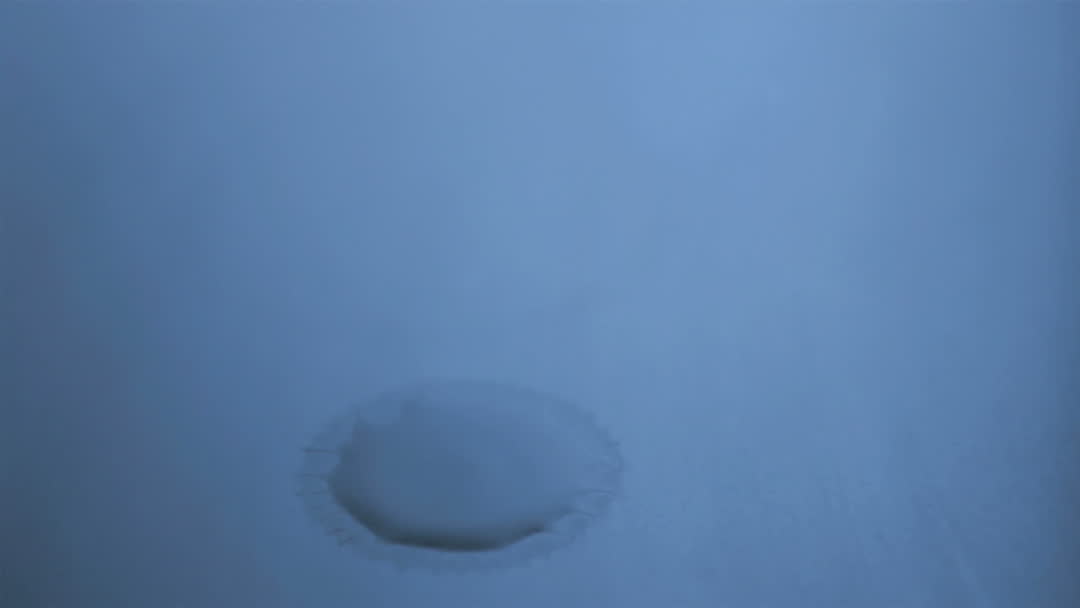 This video captures a single water droplet making contact with a surface in super slow motion, illuminated by a gentle blue light which adds to the tranquil and serene atmosphere. Ideal for projects focusing on peace, meditation, or science illustrating liquid dynamics. Useful for backgrounds, presentations about water properties, or marketing content for relaxation products.