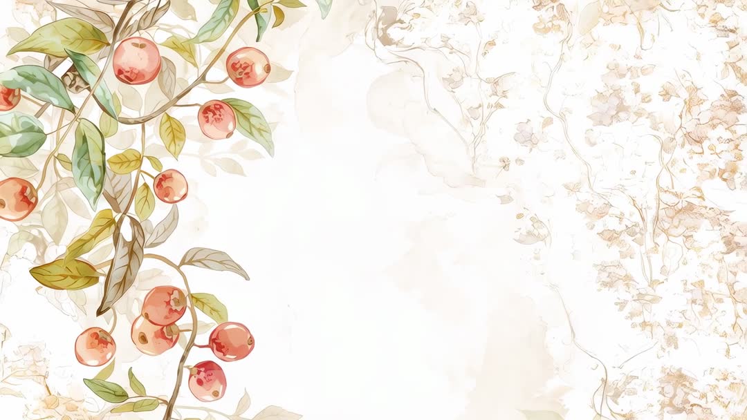 AI Generated Video. Video showing watercolor branch gently revealing red fruits and soft green leaves while framing pale cream center, creating elegant open space for text or logos. Looping border animation working well for wedding invitations, greeting cards, stationery, romantic event promos, seasonal marketing, floral blog intros, and channel bumpers. Center copy space supporting overlay text, dates, names, or product details; subtle leaf and fruit motion adding organic, calming movement without distracting. Color palette featuring warm reds, muted greens, soft creams, and gold accents; watercolor washes and delicate linework adding handcrafted, vintage feel. Supporting print and digital projects; exporting as MP4, GIF, or transparent WebM recommended for versatile use. Providing high-resolution seamless loop option and editable color layers for brand customization. Consider adding gentle pan or parallax to enhance depth and pairing with serif or script typography for elegant presentation.