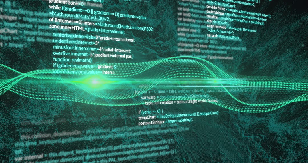 This design merges digital wave elements with streams of computer code, showcasing a futuristic representation of data flow and technological connectivity. Ideal for illustrating concepts related to programming, data processing, or futuristic tech developments.