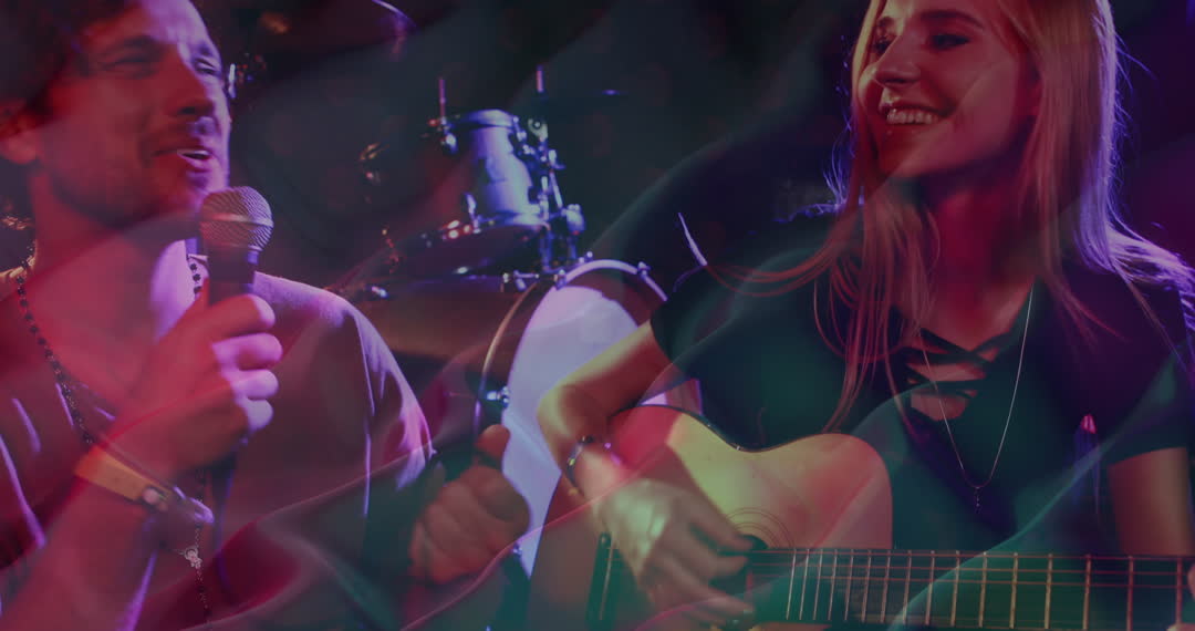 A man singing into a microphone and a woman playing guitar are featured with colorful wave patterns overlaying the scene, creating a vibrant and energetic atmosphere. This is ideal for themes of live music, festival promotions, arts, and vibrant performance posters.