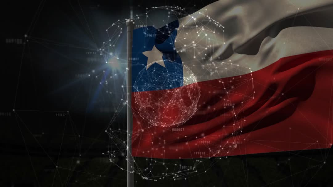 Showing Chilean flag waving at night while rotating digital globe network overlay and glowing connection nodes are animating across frame. Combining patriotic symbolism with futuristic tech elements, communicating national digital transformation, global connectivity, and data-driven progress. Offering cinematic motion, low-key lighting, and neon highlights for dramatic visual impact. Fitting technology campaigns, telecom advertising, cybersecurity presentations, government or trade promotion, and documentary or news intros. Providing edit-ready composition for overlaying titles, infographics, animated data visualizations, and logo reveals. Suggesting color grading with boosted contrast and enhanced blue-red saturation to reinforce national identity, plus subtle lens flare to emphasize network nodes.