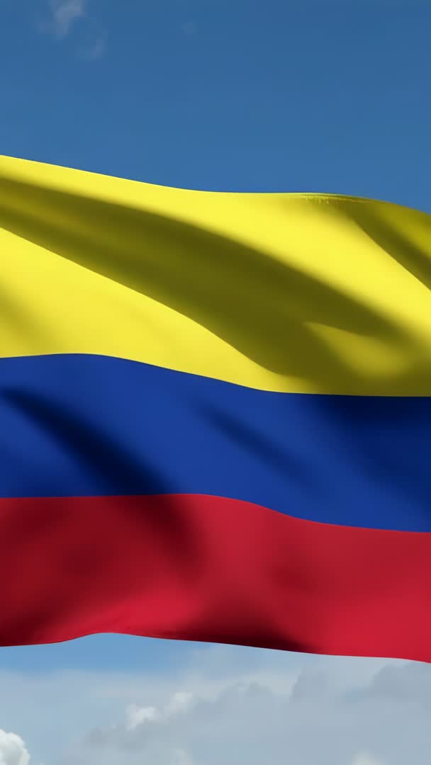 AI Generated Image. Showing close-up of Colombian flag waving against bright blue sky, highlighting vibrant yellow, blue, red stripes and flowing fabric folds. Capturing natural wind motion and soft daylight shadows for dynamic visual movement. Ideal for use in social media vertical reels, mobile advertising, news openers, national holiday promotions, tourism campaigns, cultural event intros, government broadcasts, and documentary segments. Working well as background for patriotic messages, titles, lower-thirds, transitions, and countdowns. Suitable for looping and color grading, compatible with 9:16 formats and mobile-first projects.