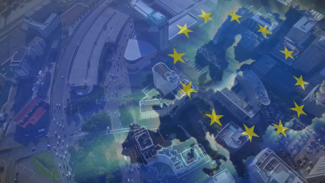 Dynamic animation showcasing European Union flag overlaying an aerial view of a vibrant urban cityscape. This visual symbolizes modern connectivity and unity within European cities, highlighting themes of globalization and innovation. Great for presentations emphasizing EU progress, urban infrastructure advancements, and societal development.