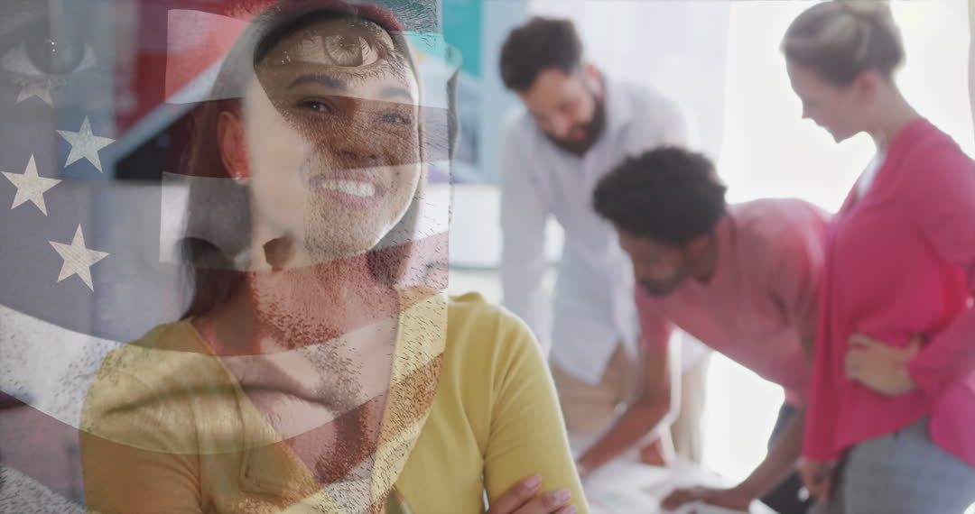 - Waving Flag of USA Blending Over Focused Diverse Business Team