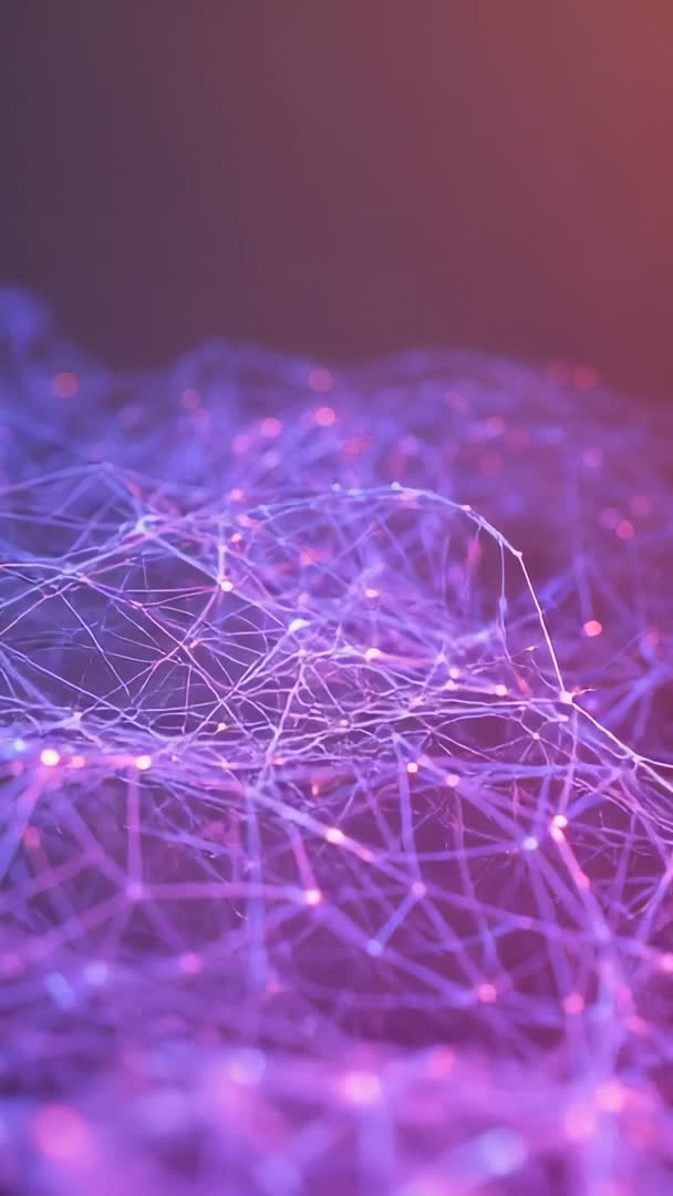 AI Generated Image. Video showing waving glowing neural network mesh as camera moves closer, revealing pulsing node detail and intricate filament connections. Color gradient shifting from deep violet to warm magenta, tiny light points flickering across surface and shallow depth of field creating cinematic feel. Using for tech presentations, AI concept visuals, mobile app intros, social media vertical ads, and conference backdrops. Looping seamlessly for continuous display and optimizing for vertical screens and mobile-first projects. Pairing with ambient electronic soundtrack and subtle sound design for immersive atmosphere. Good fit for website hero sections, pitch decks, product demos, and scientific visualizations.