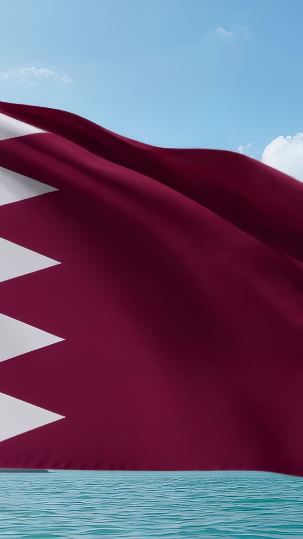 AI Generated Video. Vertical footage showing Qatar flag waving over turquoise sea with gentle breeze and clear blue sky. Close-up of maroon fabric and serrated white band rippling, creating tranquil coastal mood with distant horizon and calm water. Footage offering smooth loop potential, high-resolution detail, and ample negative space for overlay text or logo placement. Serving well for national day campaigns, patriotic broadcasts, travel promotions, coastal tourism ads, social media reels, mobile banners, and broadcast idents. Color grading suggestions: enhancing contrast and saturation to boost vivid maroon tones while preserving sky highlights. Working great for background loops, opener sequences, title screens, news lower thirds, and event intros.