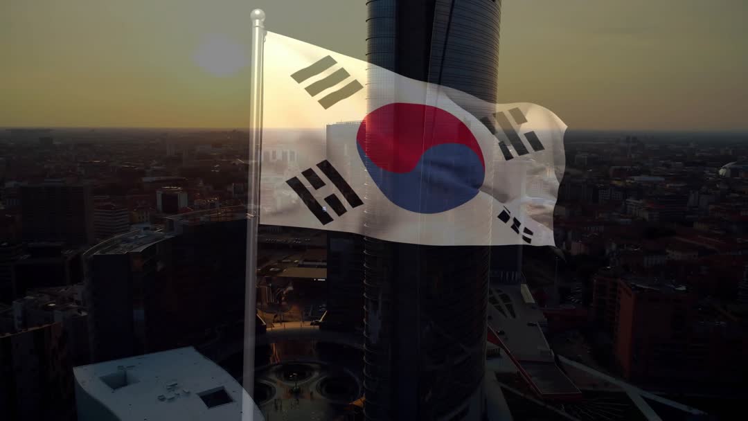 Waving South Korea Flag Over Sunset City Skyline with Towering Skyscraper Aerial Footage Video