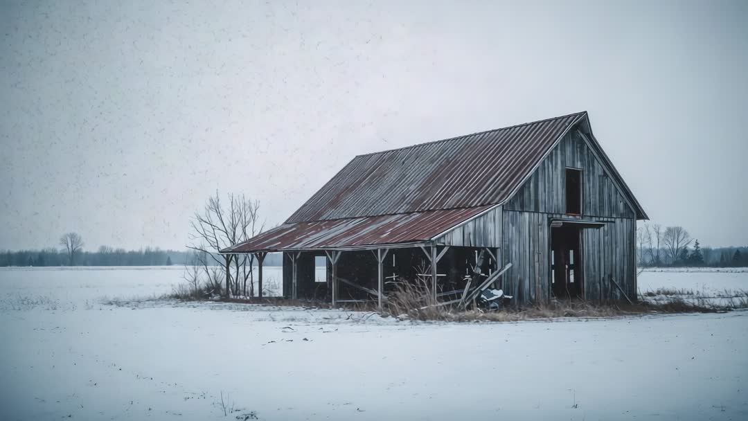 AI Generated Video. Video showing weathered wooden barn standing in snow-covered field while snowflakes falling under overcast sky. Rusted metal roof and leaning porch conveying decay, rural solitude, and seasonal stillness. Long shot revealing empty farmland, bare trees, muted color palette, and quiet winter mood. Suitable for background footage in documentary about rural decline, seasonal transitions, abandoned buildings, landscape studies, or cinematic storytelling. Use for website hero banners, social media posts, editorial articles, album covers, or video openers needing moody winter visuals. Post-production tips: boosting contrast slightly, lowering temperature for colder blue tone, adding subtle film grain for atmospheric feel. Audio suggestions: layering ambient wind, distant creaking, or sparse piano for enhancing melancholic tone. Clip variations to request: including slow push-in toward barn, overhead drone reveal, or extended time-lapse of falling snow.