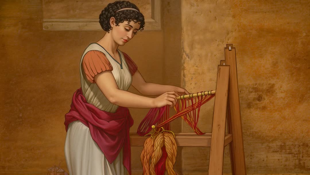 AI Generated Image. Video showing woman in classical dress weaving red-orange and amber yarn on upright wooden loom. Hands are moving across warp threads, lifting rod guiding weft strands while vibrant fibers are draping over loom beam. Warm plaster wall and soft directional light are creating rich earthy tones and painterly texture, evoking traditional atelier or historical craft scene. Style resembling classical illustration, rendered as AI-generated artwork for flexible use. Use for craft tutorials, textile history segments, artisanal branding, educational content about traditional weaving techniques, museum exhibit promos, historical documentary sequences, editorial spreads, social media storytelling, packaging for handmade goods, and interior decor prints. Footage is suitable for close-up detail edits, slow-motion sequences, and voiceover narration about fiber arts and heritage craftsmanship.