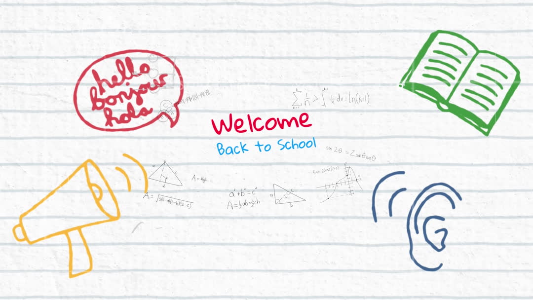 Animation showing diverse educational icons symbolizing welcome to the new school year. Includes books, mathematics equations, multiple languages, hearing, and communication symbolized by a megaphone. Perfect for educational websites, back-to-school campaigns, and promoting academic resources.