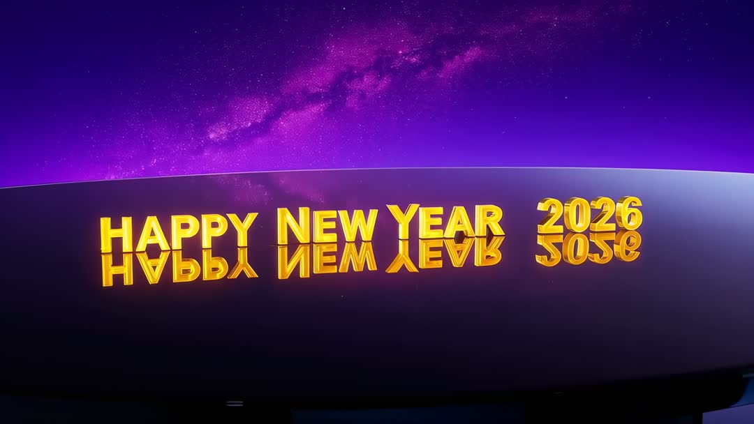 - Welcoming 2026 with glowing gold HAPPY NEW YEAR text reflecting on cosmic curved stage