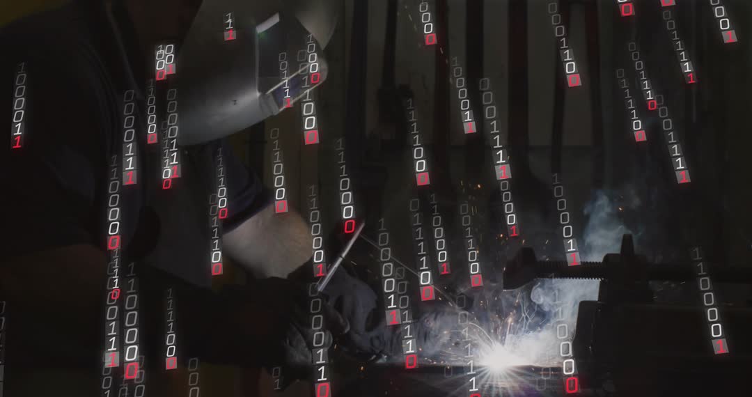 - Welder welding on metal bench with falling binary code overlay representing digital manufacturing