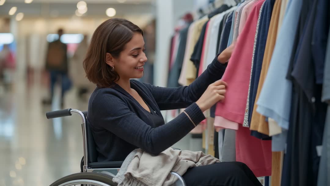 AI Generated Video. Showing young woman in wheelchair browsing clothing rack in bright mall, smiling while reaching for sweater. Featuring shallow depth of field with softly blurred background and warm overhead lighting, creating inviting retail atmosphere. Captured as mid-shot with natural body language and confident expression, highlighting independent shopping experience. Conveying inclusion, accessibility, and everyday fashion discovery for diverse audiences. Suitable for inclusive retail campaigns, accessibility awareness videos, ecommerce product pages, social media reels, in-store staff training, and editorial stories about independent living or adaptive fashion. Use as hero video on store accessibility page, thumbnail for lifestyle articles, or background clip for retail brand commercials. Suggested edits: slow pan or cutaway to close-up of garment texture, add ambient shopping sounds, include call-to-action overlay. Available for commercial and editorial licensing.